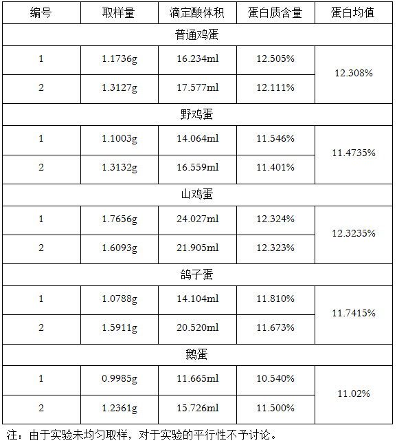 摘要:雞蛋,富含豐富的蛋白質(zhì),是人們生活中不可或缺的食品。每逢假期,商家就會(huì)打出各種雞蛋的招牌,“山雞蛋”“野雞蛋”讓消費(fèi)者應(yīng)接不暇。到底這些號(hào)稱更有營(yíng)養(yǎng)的產(chǎn)品是否實(shí)至名歸?針對(duì)上述現(xiàn)象,我們對(duì)普通雞蛋、野雞蛋、山雞蛋、鴿子蛋和鵝蛋蛋清中的蛋白質(zhì)含量進(jìn)行測(cè)定。