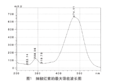 (1)檢測(cè)波長(zhǎng)的確定。稱取一定量的辣椒紅素標(biāo)準(zhǔn)品,用丙酮溶解后,配制成濃度為0.1mg/ml的標(biāo)準(zhǔn)品溶液,通過(guò)HPLC的紫外檢測(cè)器掃描得出辣椒紅素的最大吸收波長(zhǎng)。