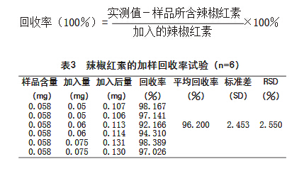 從表1的結(jié)果可見,用HPLC法測(cè)定辣椒中辣椒紅 素含量,RSD為0.24%,表明該儀器的精密度良好,測(cè)定結(jié)果較滿意。