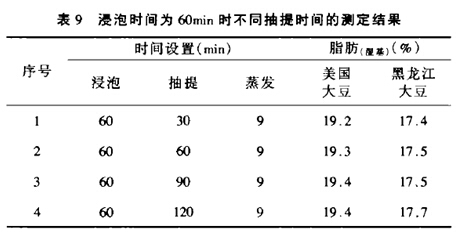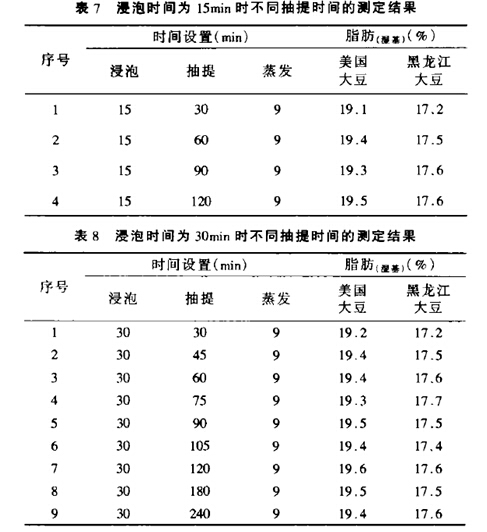 從表3-6中可以看出,浸泡時間的長短對測定結果的影響并不明顯,浸泡的目的就是讓樣品中的油脂擴散到溶劑中,在抽提過程中,油脂就可以順利地從試樣中分離出來。用自動脂肪測定儀測定大豆脂肪含量,浸泡時間為30min可以滿足實驗的要求,過多地延長浸泡時間沒有太多的意義。