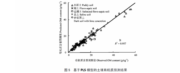 土壤有機(jī)質(zhì)估測(cè)模型的預(yù)測(cè)精度采用預(yù)測(cè)值和實(shí)際值的決定系數(shù)R2、均方根誤差RMSE 和相對(duì)分析誤差RPD(檢驗(yàn)樣本標(biāo)準(zhǔn)差SD與預(yù)測(cè)均方根誤差RMSE的比值)來(lái)衡量。R2 越大,RMSE 越小說(shuō)明模型的精度越高。另外,當(dāng)RPD>2 時(shí)表明模型具有極好的預(yù)測(cè)能力,當(dāng)1.4 2 結(jié)果與分析 2.1 不同類(lèi)型土壤光譜變化特征 從680~2 500 nm 波段范圍的光譜反射率來(lái)看,土壤光譜曲線(xiàn)除在1 400、1 900 和2 200 nm 處存在明顯的水分吸收峰,整體光譜曲線(xiàn)表現(xiàn)平緩,土壤有機(jī)質(zhì)在光譜曲線(xiàn)上無(wú)明顯譜峰。光譜的吸收不同土壤類(lèi)型具有的不同顏色所致,如砂漿黑土顏色較深,吸收多而反射率較低。 2.2 土壤有機(jī)質(zhì)模型的檢驗(yàn) 為了對(duì)土壤有機(jī)質(zhì)含量的預(yù)測(cè)能力,本文利用獨(dú)立于建模樣本外的樣品對(duì)上述模型進(jìn)行了測(cè)試和檢驗(yàn)。結(jié)果顯示,預(yù)測(cè)決定系數(shù)為0.84,均方根誤差RMSE 為3.64,RPD 為2.60。 3 討論 土壤反射光譜特性是土壤的基本特征之一,它與土壤的物理性質(zhì)有著密切的關(guān)系。不同類(lèi)型的土壤,由于理化性質(zhì)不同,其光譜特征也不同。土壤有機(jī)質(zhì)通過(guò)影響土壤理化特性和生物特性來(lái)影響土壤肥力,是衡量土壤肥力的重要指標(biāo)之一。本文利用PLS計(jì)算方法建立預(yù)測(cè)模型,其預(yù)測(cè)精度是可以滿(mǎn)足土壤有機(jī)質(zhì)監(jiān)測(cè)的需要,本實(shí)驗(yàn)的樣品均經(jīng)過(guò)風(fēng)干、研磨等處理,當(dāng)用到田間預(yù)測(cè)時(shí),土壤有機(jī)質(zhì)參數(shù)及其估算模型還需進(jìn)一步檢驗(yàn)和完善。 4 結(jié)論 本文基于5 種不同類(lèi)型土壤樣本,用PLS化學(xué)計(jì)量學(xué)方法建立土壤中有機(jī)質(zhì)的預(yù)測(cè)模型,通過(guò)模型外樣本進(jìn)行驗(yàn)證,得出很好的預(yù)測(cè)結(jié)果。說(shuō)明近紅外光譜技術(shù)檢測(cè)土壤中有機(jī)質(zhì)含量是可行的。
