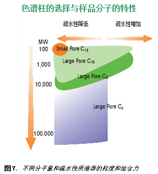 HPLC曾多年使用孔徑約100Å的微粒。這種多肽色譜法很差,部分是因為許多多肽分子太大而無法進入這種直徑的孔中。Grace Vydac為HPLC改進的大孔徑(~300 Å)球形硅膠微粒宣告了用RP-HPLC有效分離多肽的開始。今天,雖然有些肽(<~2000 MW)也能用100 Å孔徑的微粒分離,但大多數多肽都是用孔徑約300 Å的微粒填充色譜柱來完成分離的。