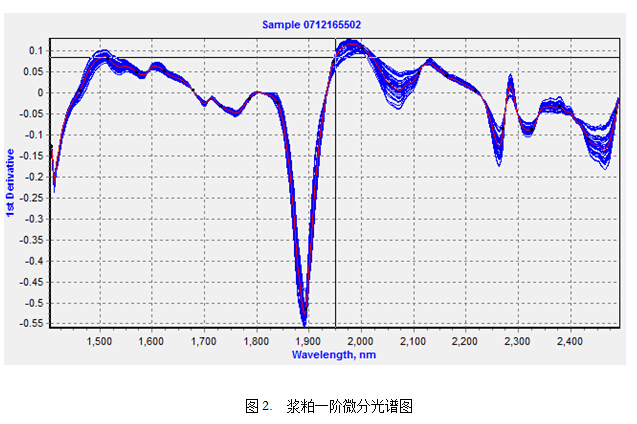 建立定標(biāo)模型數(shù)據(jù):制備不同水分含量的漿粕樣品21個,每個樣品掃描2次(其中一個樣品掃描3次),共得43張光譜。