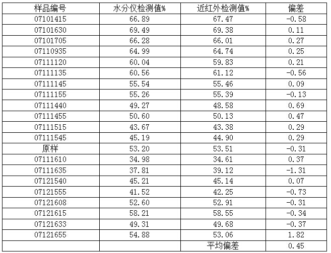 上述可見,通過此方法制備漿粕樣品,使其水分含量形成一定范圍的梯度,并通過化學(xué)偏最小二乘法進(jìn)行建模是完全可行的。模型中漿粕水分含量與近紅外光譜有很好的線性關(guān)系,達(dá)到0.995。