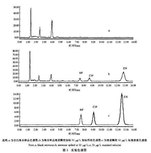 高效液相色譜法測定海水中環(huán)丙沙星含量的方法,并測定其衰減度,在O~6 h內(nèi)環(huán)丙沙星衰減很快,但6 h后其濃度基本穩(wěn)定,同時(shí)還發(fā)現(xiàn)環(huán)丙沙星在海水中衰減程度隨鹽度的增加而加快。利用高效液相色譜法分析城市河水中的多種抗生素,水樣由稀鹽酸調(diào)pH至4.2后經(jīng)HLB固相萃取,用內(nèi)標(biāo)法通過HPLC進(jìn)行定量分析。對海水養(yǎng)殖環(huán)境中喹諾酮類殘留量的檢測研究報(bào)道較少。為減少海水養(yǎng)殖環(huán)境中鹽分、浮游生物及微小顆粒對喹諾酮類測定存在的干擾,本研究采用固相萃取技術(shù)對海水中的3種喹諾酮類抗生素進(jìn)行富集和凈化處理,采用高效液相色譜熒光檢測器測定,建立了諾氟沙星、環(huán)丙沙星和恩諾沙星3種喹諾酮類抗生素殘留檢測方法,并測試了青島附近黃海海水養(yǎng)殖區(qū)(從36。40.303’N,121。8.939’E至35。39.36 7N,119。52.433 7E)海水中的喹諾酮的含量,為海水中藥物的生態(tài)風(fēng)險(xiǎn)評估提供依據(jù)。