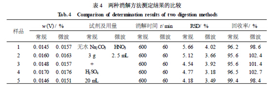 2. 3 兩種消解方法測(cè)定結(jié)果的比較用常規(guī)法和微波消解法(按照表3 微波消解最佳程序) 消解樣品,然后按1. 2 分別進(jìn)行測(cè)定,并分別進(jìn)行加標(biāo)實(shí)驗(yàn),結(jié)果列于表4 中。由表4 可見,兩種方法測(cè)定結(jié)果基本吻合。與常規(guī)法相比,微波消解法溶解方便,溶解條件易控制,重現(xiàn)性好,且消解時(shí)間短,消解的速度是常規(guī)的10 倍,酸用量小,減少了環(huán)境污染。因此,微波消解分光光度法測(cè)定石油焦中的釩是一種新的綠色環(huán)保方法,更適合于實(shí)際生產(chǎn)的需要。