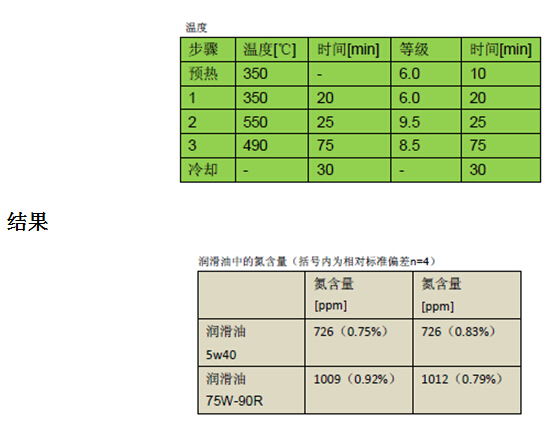 潤滑油用于電機(jī)的冷卻和潤滑,使用時會產(chǎn)生不溶性氧化產(chǎn)物。產(chǎn)物蓄積會損害電機(jī)。潤滑油中的低氮含量可以避免蓄積物的產(chǎn)生。樣品用硫酸消化,將氮轉(zhuǎn)化為硫酸銨鹽。硫酸銨鹽與NaOH反應(yīng)后生成NH3,用水蒸汽蒸餾,NH3被硼酸吸收,最后用硫酸標(biāo)準(zhǔn)液滴定。