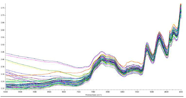 樣品無需預處理,采用積分球模塊采集樣品光譜。光譜采集條件:波數(shù)范圍10000 cm-1~4000 cm-1,掃描次數(shù)64,分辨率8 cm-1。圖1為所有樣品的近紅外漫反射光譜圖。