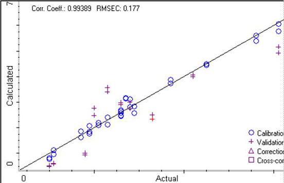 從上圖可以看出,建立模型的相關系數(shù)(Corr.Coeff.)達到了0.99389,校正均方差(RMSEC)為0.177,建模結(jié)果較為理想。