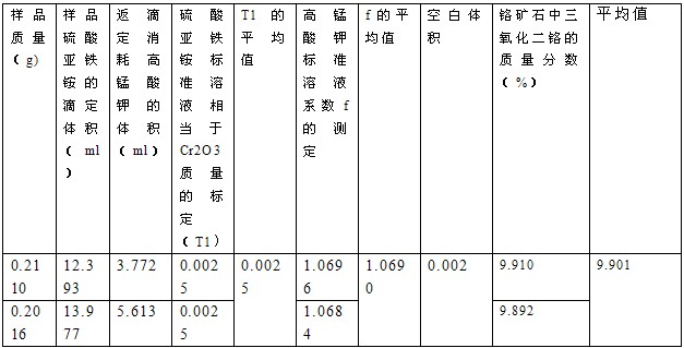 3.4滴定。將消解好的鉻礦粉樣品轉(zhuǎn)移至滴定杯中,并使用少量蒸餾水清洗消解罐,清洗液也全部轉(zhuǎn)移至滴定杯中,將電極插入到溶液中并調(diào)整好位置。儀器面板上選擇常量滴定,并設(shè)定好相應(yīng)參數(shù)后進(jìn)行滴定。