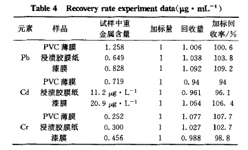 FAAS測定PVC薄膜、浸漬膠膜紙和漆膜的鉛元素和PVC薄膜的鎘元素,GFAAS測定浸漬膠膜紙和油漆涂膜的鎘元素。每種待測液連續(xù)測定5次,相對(duì)標(biāo)準(zhǔn)偏差(RSDN)見表5。根據(jù)表5,F(xiàn)AAS和GFAAS在檢測樣品時(shí),相對(duì)標(biāo)準(zhǔn)偏差均小于5 g,顯然該方法精密度較高。
