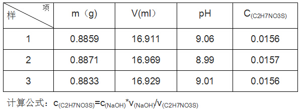 測定方法:準確稱取;撬犷w粒,加水90ml,振搖使主要成分溶解,用氫氧化鈉滴定液(0.1mol/L)調(diào)節(jié)pH至7.0,加入預先調(diào)節(jié)pH的甲醛溶液15ml,搖勻,以pH復合電極作為滴定電極,選用終點設置滴定,用NaOH滴定液(0.1mol/L)滴定至pH至9.0并持續(xù)30秒鐘,以加入甲醛溶液后消耗的NaOH滴定液(0.1mol/L)的量計算,以1ml NaOH滴定液(0.1mol/L)相當于12.15mg C2H7NO3S。