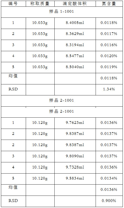 采用邊蒸餾邊滴定模式,凱氏定氮儀儀器參數(shù)設(shè)置為硼酸(含指示劑):10ml;堿:10ml;稀釋水:10ml;蒸餾:5min;滴定酸濃度:0.0104mol/L。測試結(jié)果如下: