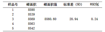 (3)精密度試驗(yàn)。取任意一樣品,連續(xù)5次進(jìn)樣,并對(duì)其進(jìn)行面積積分。本試驗(yàn)為了有針對(duì)性地考察,采用辣椒紅素標(biāo)準(zhǔn)品作為研究對(duì)象,分別吸取濃度為0.1mg/ml的辣椒紅素標(biāo)準(zhǔn)品溶液2μl,統(tǒng)計(jì)峰面積并計(jì)算相對(duì)標(biāo)準(zhǔn)偏差RSD%。用于評(píng)價(jià)儀器的可靠性。