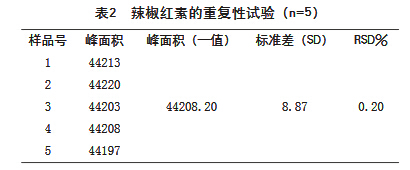 從表1的結(jié)果可見,用HPLC法測(cè)定辣椒中辣椒紅 素含量,RSD為0.24%,表明該儀器的精密度良好,測(cè)定結(jié)果較滿意。