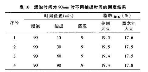 從表3-6中可以看出,浸泡時間的長短對測定結果的影響并不明顯,浸泡的目的就是讓樣品中的油脂擴散到溶劑中,在抽提過程中,油脂就可以順利地從試樣中分離出來。用自動脂肪測定儀測定大豆脂肪含量,浸泡時間為30min可以滿足實驗的要求,過多地延長浸泡時間沒有太多的意義。