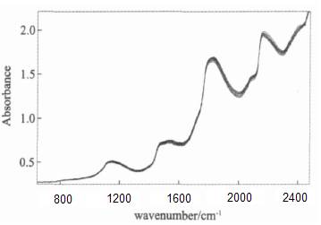 實(shí)驗(yàn)儀器采用近紅外光譜儀,進(jìn)行全譜測(cè)定,采集牛奶樣品在近紅外光譜680-2500nm整個(gè)區(qū)域的光譜信息。裝樣時(shí)需將牛奶樣品倒入至樣品杯約1/5位置 ,采用旋轉(zhuǎn)頂窗設(shè)計(jì),漫反射方式測(cè)定樣品N IR 漫反射光譜。 儀器參數(shù)設(shè)定如下:掃描范圍為680-2500nm,掃描間隔1nm,重復(fù)掃描24次求平均光譜. 兩組牛奶樣品的近紅外光譜如圖1和圖2所示.