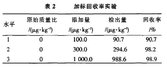 取同一樣品,分別加入不同質(zhì)量比的標準樣品,測定回收率.結(jié)果見表2。