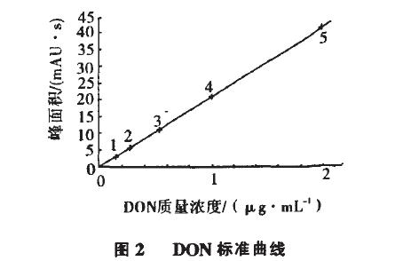 色譜條件:C18親水性分離柱(250×4.6 mill,5斗m),柱溫箱40℃,紫外檢測器波長220 nm,流動相:y(水):y(甲醇):y(乙腈)=92:4:4,流速1.5 mL/rain,進樣量20斗L。標準曲線的繪制:使DON質(zhì)量濃度分別為0.10、0.25、0.50、1.00、2.00、5.00、10.00ug/mL,將該標準系列分別進樣20燦L,以DON的質(zhì)量濃度為橫坐標,峰面積為縱坐標繪制標準曲線。