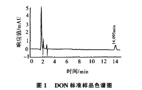 從圖3可見。在DON的出峰時間14.095 min左右沒有雜質(zhì)干擾峰,表明本方法專屬性很好。