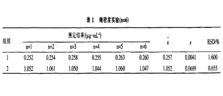 取兩組不同含量的樣品各6個.分別確定方法的精密度。結(jié)果見表1。