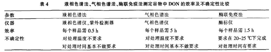3.2液相色譜法與氣相色譜法、酶聯(lián)免疫法測定谷物中DON的效率及不確定性比較GB/T5009.111-20031第二法中規(guī)定采用酶聯(lián)免疫法(ELISA),而現(xiàn)在氣相色譜檢測方法也倍受關(guān)注。將這3種方法在檢測效率及不確定性方面做了比較2,見表4。