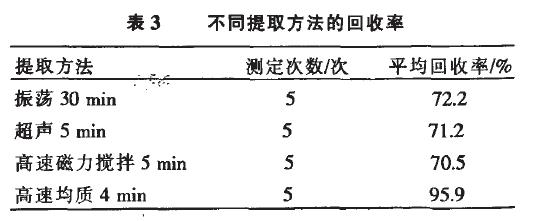 由表3可以看出,振蕩、超聲、磁力攪拌提取方法的平均回收率只有70%左右,不能滿足分析的需要,而高速均質(zhì)法可使平均回收率達到95.9%。作者曾進一步改變高速均質(zhì)的時間來對比回收率,實驗結(jié)果表明,隨著均質(zhì)時間的延長回收率有小幅上升,當均質(zhì)時間大于4 min后;厥章薀o明顯提高。故本方法確定的最佳提取方式是高速均質(zhì)4 min。