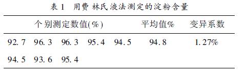測得制取的木薯純品淀粉含量94.8%, 由上表也可以看出, 費林氏液法弊端, 重復性較差。
