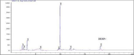 采用此法測(cè)定DEHP時(shí)方法在10-500ug/ml范圍內(nèi)線性良好。方法用于測(cè)試A品牌果汁中的塑化劑含量,其DEHP含量為172mg/kg(ppm),該果汁的中塑化劑含量嚴(yán)重超過標(biāo)準(zhǔn)。方法中前處理簡單便捷,方法測(cè)試準(zhǔn)確可靠,適合于果汁飲料檢測(cè)。