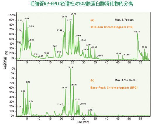 圖16.用內徑300µm的毛細RP-HPLC色譜柱對BSA的胰蛋白酶消化物的分離。 樣品:3皮摩爾 色譜柱:VYDAC 218MS5.305 5μm, 300 A, 聚合物-C18反相柱(300μm 內徑x 50mm柱長). 流速:5 μL/min. 流動相: A = 0.1%甲酸,98%水,2% CAN;B = 0.1% 甲酸, 98% ACN, 2%水。 梯度:3%B保持0-5分鐘,然后從3%B漸變到65min時的50%B,最終70min時漸變到75%B。 檢測器:質譜(MS)。 (a)總離子數。(b)基峰強度。 基峰是指色譜圖中每次振幅最大時的單個質譜峰;宓纳V圖強調了含有單個主要分子的峰,消除了異常峰和噪聲。