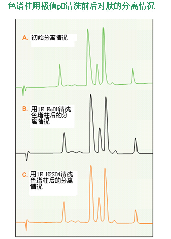 用合成聚合物制成的分離材料的一個優(yōu)點是,它們在pH極值時不分解。這樣,在色譜后能使用強酸或強堿溶液作為清洗劑把蛋白質或其它物質從色譜柱上洗下來,見圖13,在這個例子中,基于聚苯乙烯- 二乙烯基苯的色譜柱可以用強堿(1N氫氧化鈉)和強酸(1N硫酸)進行清洗。清洗前、用強酸清洗后和用強堿清洗后肽的色譜分析都產生相似的峰形、保留時間和分離度,這證明用強試劑清洗柱子并不會對色譜柱的性能產生負面影響。