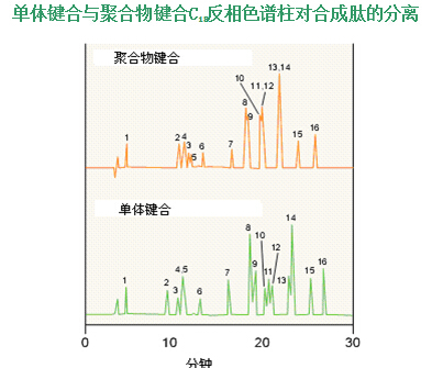什么是聚合物鍵合?它又是怎樣影響肽的選擇性的?反相HPLC吸附劑一般通過把含有一個活性氯的氯硅烷烴鍵合到硅膠基質上制成。這些就形成了所謂的單體鍵合相,它在硅膠基質上有一個附著點。也可以用具有多個活性氯的氯硅烷烴,這就是所謂的聚合物鍵合相,單個氯硅烷烴在相中交聯并在硅膠基質上面形成硅氧烷聚合物,同時附著多個疏水鏈。雖然單體鍵合相與聚合物鍵合相的疏水性和分離特性相似,但在分離肽時,尤其是蛋白質的酶消化物中的肽時,它們會具有不同的選擇性。這種不同的選擇性為色譜工作人員優(yōu)化蛋白質消化物和其它肽的選擇性和分離度提供了更多的選擇空間。圖11給出了用單體鍵合吸附劑和聚合物鍵合吸附劑分離一系列合成多肽的例子。這些肽分離選擇性的明顯差異已經標出,但同時也提供了進行肽分離時對色譜柱的另一種選擇。