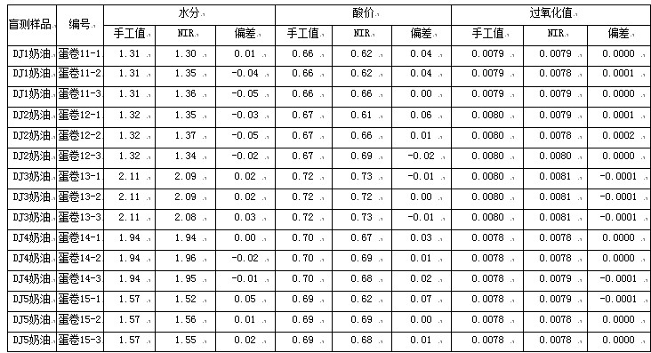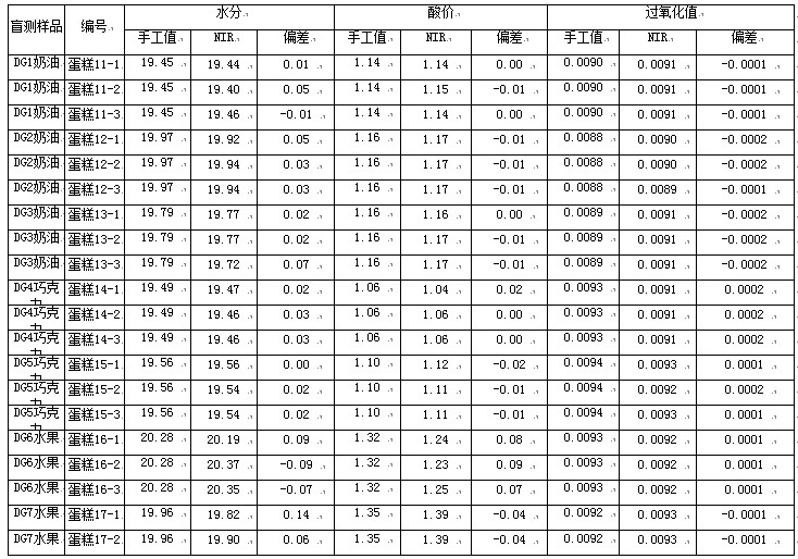 從上表可以看出,蛋糕各指標(biāo)預(yù)測偏差較小,水分、酸價、過氧化值預(yù)測偏差分別為0.05、0.01、0.0000。完全能夠符合實驗室檢測要求,通過后期模型的維護(hù)和樣品添加,使得模型適應(yīng)性更好。