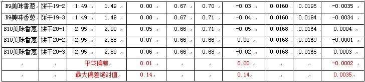 從上表可以看出,餅干各指標(biāo)預(yù)測偏差較小。水分、酸價、過氧化值預(yù)測偏差分別為0.01、0.00、-0.0002。完全能夠符合實驗室檢測要求,通過后期模型的維護(hù)和樣品添加,使得模型適應(yīng)性更好,準(zhǔn)確性更高。