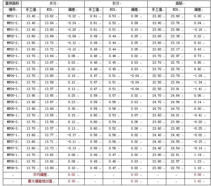 表4. 面粉的實驗室數(shù)據(jù)與NIR檢測結(jié)果對比