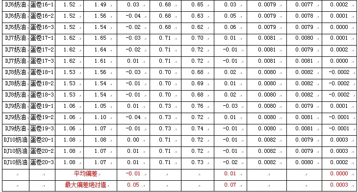 從上表可以看出,蛋卷各指標(biāo)預(yù)測偏差較小,水分、酸價、過氧化值預(yù)測偏差分別為-0.01、 0.01、0.0000。完全能夠符合實驗室檢測要求,通過后期模型的維護(hù)和樣品添加,使得模型適應(yīng)性更好,準(zhǔn)確性更高。