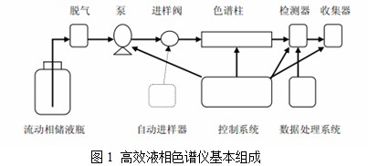 其基本原理是用高壓泵將具有一定極性的單一溶劑或不同比例的混合溶劑泵入裝有填充劑的色譜柱,經(jīng)進(jìn)樣閥注入的樣品被流動相帶入色譜柱內(nèi)進(jìn)行分離后依次進(jìn)入檢測器,由記錄儀、積分儀或數(shù)據(jù)處理系統(tǒng)記錄色譜信號或進(jìn)行數(shù)據(jù)處理而得到分析結(jié)果。其基本組成如下圖所示: