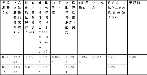 3.4滴定。將消解好的鉻礦粉樣品轉(zhuǎn)移至滴定杯中,并使用少量蒸餾水清洗消解罐,清洗液也全部轉(zhuǎn)移至滴定杯中,將電極插入到溶液中并調(diào)整好位置。儀器面板上選擇常量滴定,并設(shè)定好相應(yīng)參數(shù)后進行滴定。