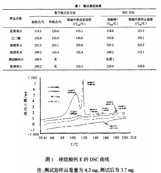 在塑料改性時(shí)需要用到大量的低分子有機(jī)物材料,這些材料質(zhì)量好壞直接會影響到生產(chǎn)工藝、產(chǎn)品性能,因此對這些材料的質(zhì)量控制是產(chǎn)品質(zhì)量保證的重要手段。根據(jù)物理化學(xué)的定義,物質(zhì)的熔點(diǎn)是指該物質(zhì)由固態(tài)變?yōu)橐簯B(tài)的溫度,在有機(jī)化學(xué)領(lǐng)域中,對于純粹的有機(jī)化合物,一般都有固定熔點(diǎn),但如混有雜質(zhì)則其熔點(diǎn)發(fā)生變化。因此熔點(diǎn)測定是辨認(rèn)物質(zhì)的基本手段,也是純度測定的重要方法之一。常用的方法有毛細(xì)管法和DSC法。由于毛細(xì)管法操作簡單、快捷,測試結(jié)果重復(fù)性好,再加上歷史原因,毛細(xì)管法測量藥物的熔點(diǎn)已是載入各國藥典的方法;隨著測試儀器的技術(shù)進(jìn)一步發(fā)展,特別是熱分析技術(shù)的發(fā)展,DSC在有機(jī)物熔點(diǎn)測試的應(yīng)用越來越多,且理論也日趨成熟,但國內(nèi)關(guān)于毛細(xì)管法和DSC法比較的研究進(jìn)行的不多,且局限在純度較高的物質(zhì)如藥物上。從這些研究看來,對于純度高組分單一有機(jī)物的熔點(diǎn),毛細(xì)管法和DSC法測試的結(jié)果比較一致。李書文用DSC法和毛細(xì)管法測量了香草醛等五種熔點(diǎn)標(biāo)樣的熔點(diǎn)[1],認(rèn)為DSC曲線上的外推起始溫度和峰溫分別對應(yīng)于毛細(xì)管法測量的初熔溫度和終熔溫度。在改性塑料改性中所用低分子有機(jī)物,有不少是多組分的,對于這些純度低組分多的有機(jī)物。哪種方法在實(shí)際生產(chǎn)中更具有指導(dǎo)意義?為了研究兩種方法在低分子有機(jī)物熔點(diǎn)測試上的差別,我們對不同的樣品分別進(jìn)行測試,并對測試結(jié)果進(jìn)行分析討論,得到極其指導(dǎo)意義實(shí)際應(yīng)用的滿意結(jié)論。