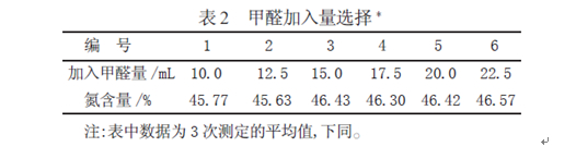 處理方法與“2.2”類似,改變加入甲醛溶液的量,如表2 所示,測定氮含量,可以看出甲醛量控制在15~20 mL 即可。