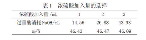 準(zhǔn)確稱取脲,直接加入不同量的濃硫酸消化(如表1所示),反應(yīng)結(jié)束后加20 mL 左右的去離子水,蓋上表面皿,在電熱套中緩慢加熱,控制好溫度,防止樣品受熱水解時產(chǎn)生大量的H2O、CO2、NH3 等氣體逸出,造成樣品中氮的損失?刂茣r間直到冒煙較少,然后持續(xù)增溫1~2 min,冷卻至室溫,定容于250 mL容量瓶中。分別準(zhǔn)確移取20.00 mL脲溶液于滴定杯中,放入磁子,點(diǎn)擊“預(yù)滴定”,用NaOH 標(biāo)液中和多余的游離酸,達(dá)到終點(diǎn)立刻終止滴定,后加入15 mL甲醛溶液,要充分搖勻,放置5~10 min,使其充分反應(yīng),再到自動滴定儀上滴定,測定氮含量,可以看出濃硫酸量控制在1~2 mL即可。