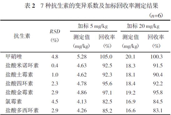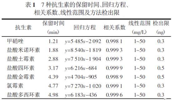 在設(shè)定色譜條件下,標準系列溶液的絕對質(zhì)量與色譜峰面積呈線性相關(guān)。檢測下限以噪音的3 倍計算。7 種抗生素的回歸方程、相關(guān)系數(shù)、線性范圍及儀器檢出限見表l。