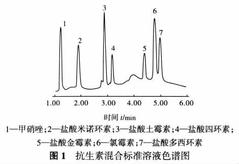 流動相優(yōu)化:流動相中的有機相選擇借鑒了《規(guī)范》[1]。四環(huán)素類化合物屬于兩性化合物,從色譜理論上講,流動相可以是酸性或堿性,但由于鹽酸四環(huán)素和鹽酸土霉素在堿性條件下易破壞失效[8],所以選擇酸性流動相。隨著改變流動相中甲酸含量分別為0.1%,0.2%,0.5%和1.0%,發(fā)現(xiàn)甲硝唑的保留時間逐步變化,當甲酸含量為1.0%時,保留時間逐步達到穩(wěn)定,方法的重現(xiàn)性和耐用性最佳。由于7 種化合物的極性差別大,所以宜采用梯度洗脫方式。另外,試驗顯示采用梯度洗脫比等度洗脫更能提高目標物質(zhì)的檢測靈敏度。圖1 為7 種抗生素的標準色譜圖,各化合物在5 min 內(nèi)得到分離,其保留時間見表1。