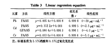 2.2標(biāo)準(zhǔn)曲線及線性范圍FAAS的鉛Pb、鎘CA、鉻Cr元素和GFAAS的鎘Cd元素標(biāo)準(zhǔn)曲線的線性方程、相關(guān)系數(shù)和線性范圍見表3。