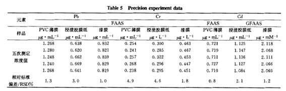 FAAS測定PVC薄膜、浸漬膠膜紙和漆膜的鉛元素和PVC薄膜的鎘元素,GFAAS測定浸漬膠膜紙和油漆涂膜的鎘元素。每種待測液連續(xù)測定5次,相對(duì)標(biāo)準(zhǔn)偏差(RSDN)見表5。根據(jù)表5,F(xiàn)AAS和GFAAS在檢測樣品時(shí),相對(duì)標(biāo)準(zhǔn)偏差均小于5 g,顯然該方法精密度較高。