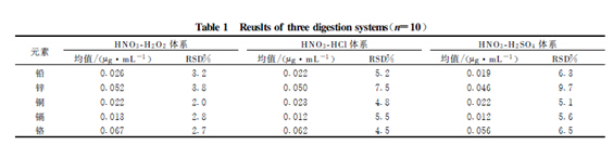 取10 份空白濾膜,分別采用HNO3 ‐H2 O2 ,HNO3‐HCl ,HNO3 ‐H2 SO4 幾種消解體系消解,測定結(jié)果見表1 。由測試結(jié)果可知:HNO3 ‐H2 O2 消解體系由于測試結(jié)果最高且RSD最低,所以認為HNO3‐H2 O2 消解體系比其他兩種消解體系更徹底和更穩(wěn)定。