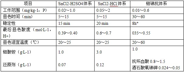 上述三種方法SnCl2-H2SO4體系最靈敏,鉬銻抗—硫酸體系的靈敏度接近SnCl2-H2SO4體系,而顯色穩(wěn)定,受干擾離子的影響亦較小,更重要的是還原劑與鉬試劑配成單一溶液,一次加入,簡(jiǎn)化了操作手續(xù),有利于測(cè)定方法的自動(dòng)化,因此目前鉬銻抗—硫酸體系被廣泛采用。