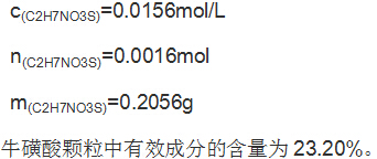 測定方法:準確稱取;撬犷w粒,加水90ml,振搖使主要成分溶解,用氫氧化鈉滴定液(0.1mol/L)調(diào)節(jié)pH至7.0,加入預先調(diào)節(jié)pH的甲醛溶液15ml,搖勻,以pH復合電極作為滴定電極,選用終點設置滴定,用NaOH滴定液(0.1mol/L)滴定至pH至9.0并持續(xù)30秒鐘,以加入甲醛溶液后消耗的NaOH滴定液(0.1mol/L)的量計算,以1ml NaOH滴定液(0.1mol/L)相當于12.15mg C2H7NO3S。