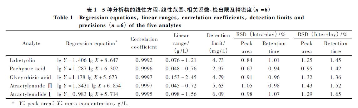 將對(duì)照品儲(chǔ)備液稀釋成不同的濃度,按前述色譜條件測(cè)定峰面積,分別以各分析物色譜峰面積( Y) 的對(duì)數(shù)值為縱坐標(biāo)、質(zhì)量濃度( X,g /L) 的對(duì)數(shù)值為橫坐標(biāo)繪制標(biāo)準(zhǔn)曲線,得到黨參炔苷、茯苓酸、甘草酸、蒼術(shù)內(nèi)酯Ⅲ和白術(shù)內(nèi)酯Ⅰ的線性方程、相關(guān)系數(shù)和線性范圍( 見表1) 。取混合對(duì)照品儲(chǔ)備液不斷稀釋后進(jìn)樣分析,以3 倍信噪比確定檢出限,結(jié)果