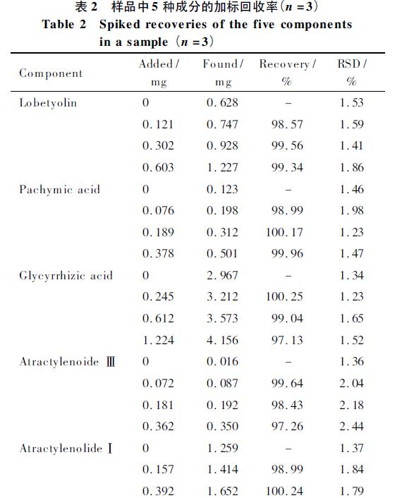 精密稱取自制的丸劑12 份,分為4 組,每組3份。每組樣品中分別精密加入混合對(duì)照品儲(chǔ)備液0,20,50,100 μL,按所建立的方法進(jìn)行供試品溶液的制備和測(cè)定,計(jì)算黨參炔苷、茯苓酸、甘草酸、蒼術(shù)內(nèi)酯Ⅲ和白術(shù)內(nèi)酯Ⅰ的含量,計(jì)算各組分的回收率,結(jié)果見表2。